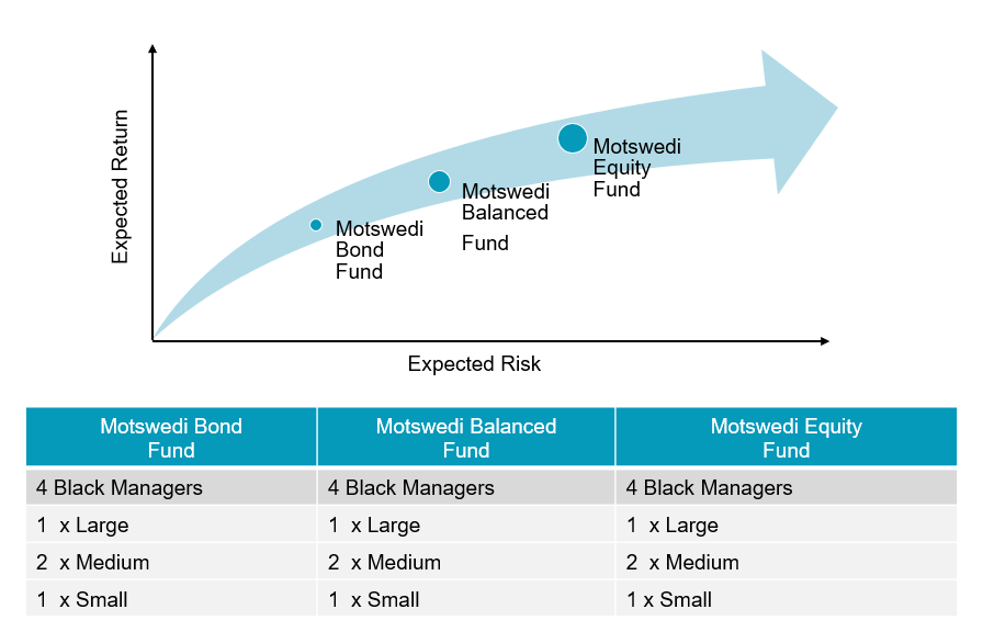 Motswedi offers 3 multi-managed portfolios consisting exclusively of black-owned asset managers, covering the full risk/return spectrum, from bonds to equity.